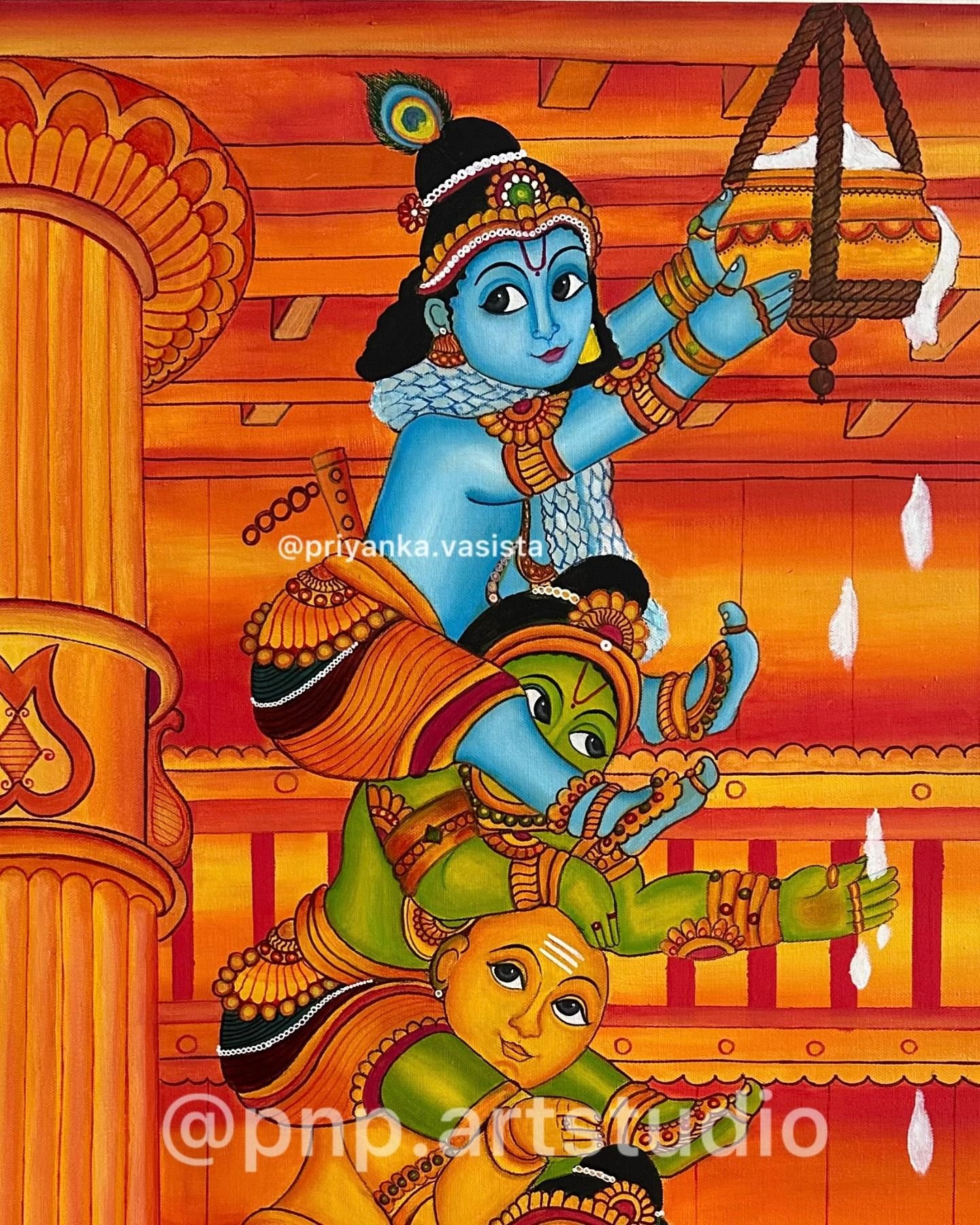 A hand-painted joyful painting of Krishna with his companions