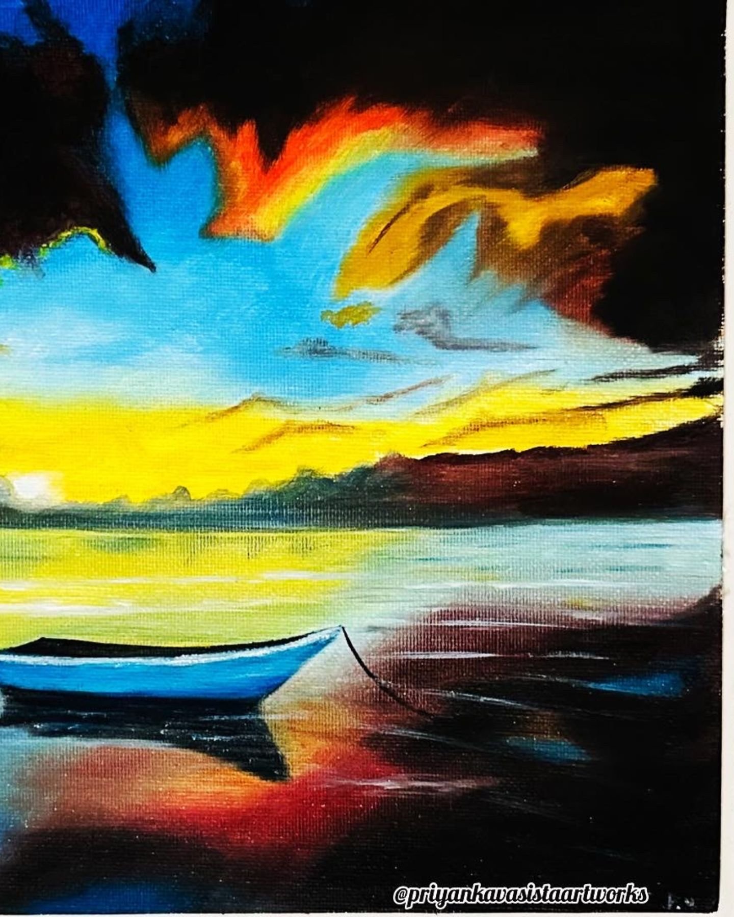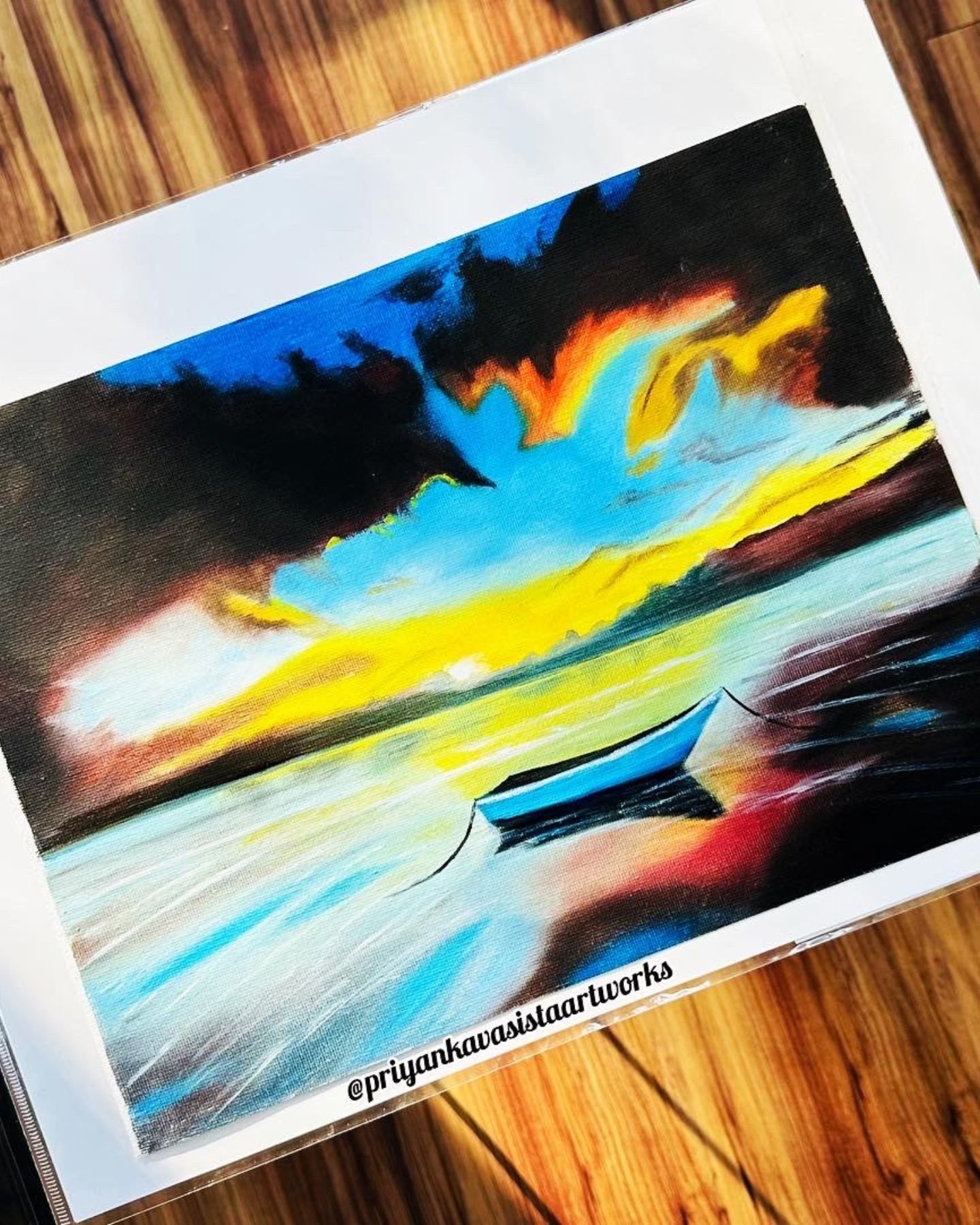 SereneĀ  Handpainted sunset boat art with calming tones.